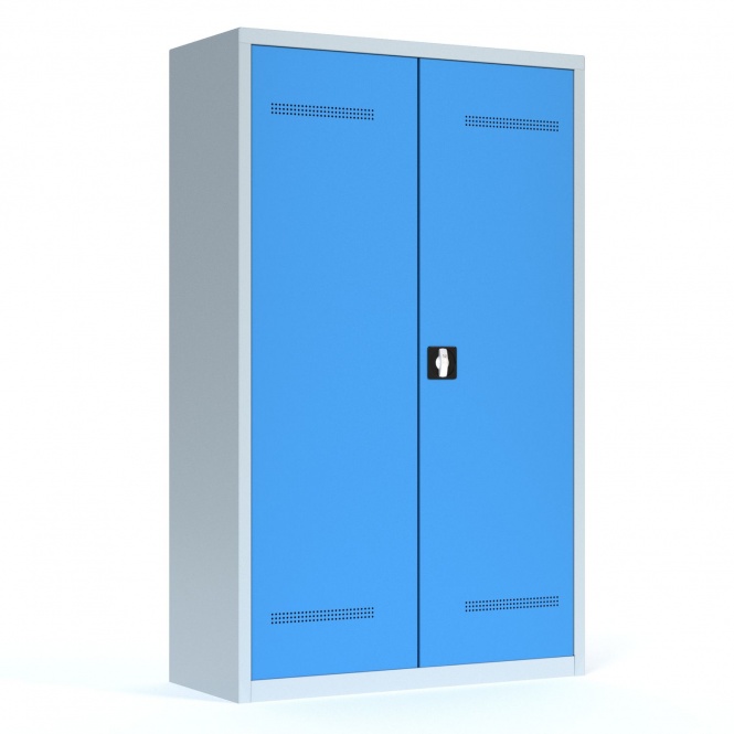 Der Garderobenschrank hat zwei Flügeltüren mit Design-Lüftungslöchern.
