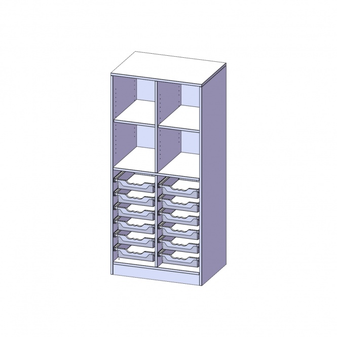 ErgoTray Regal, 2reihig, 4 OH, oben 4 Fächer unten 12 flache Boxen, B/H/T 70,3x154x50cm