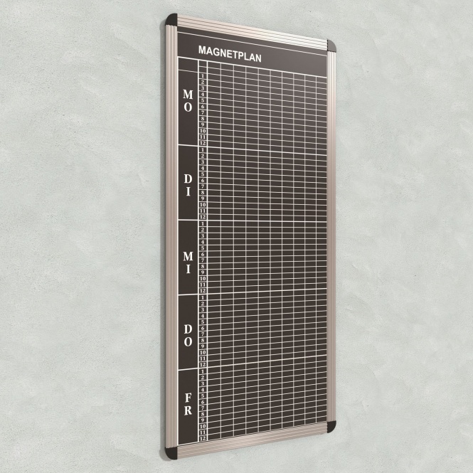 Stahlemaille Anthrazit mit weißem Stundenplanraster und Aluminiumrahmen.