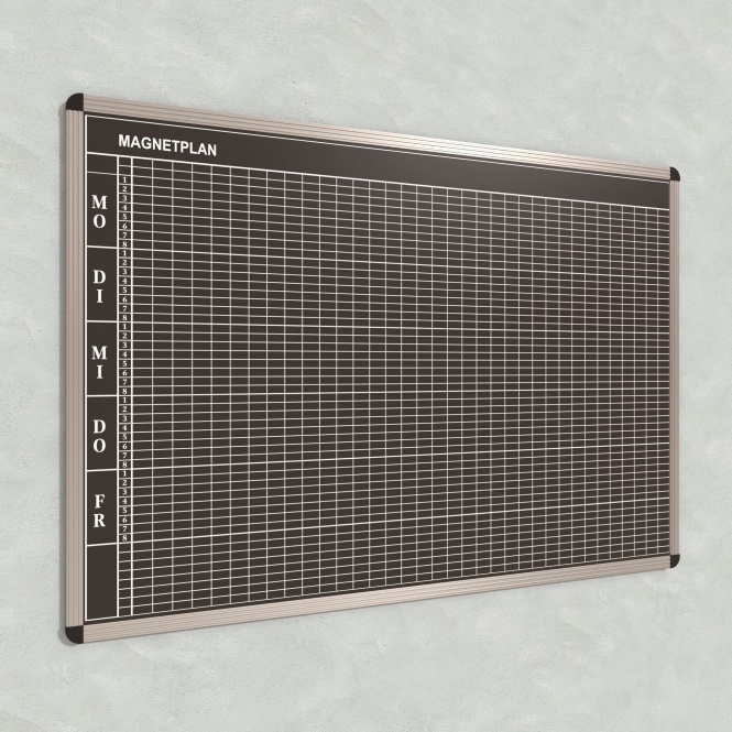 Stahlemaille Anthrazit mit weißem Stundenplanraster und Aluminiumrahmen.