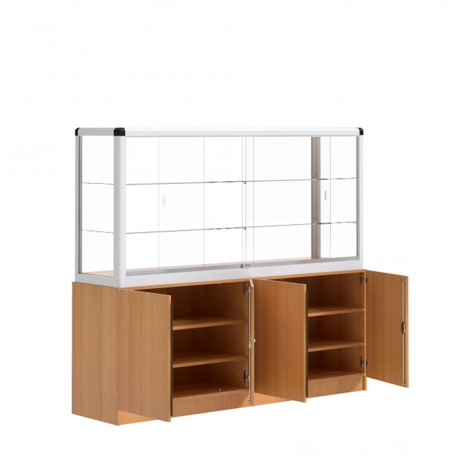 Freistehende Ausstellungsvitrine mit Unterschrank, Glas-Rückwand