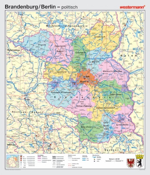 Wandkarte Berlin/ Brandenburg, phys.(Vorderseite), polit.(Rückseite), 147x171 cm,